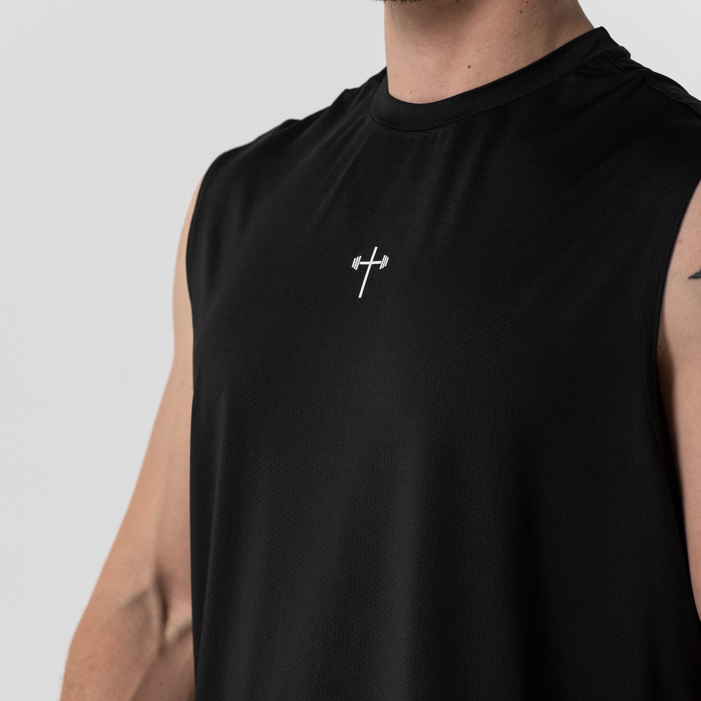 - Front Design: Subtle cross chest logo
